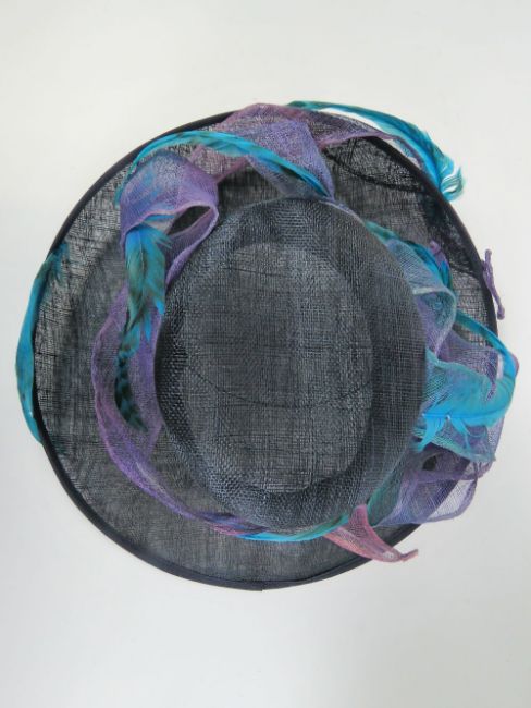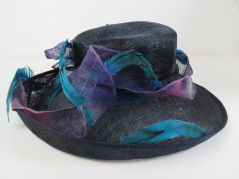 Ladies hat by Helene De Reboul in purples and blues, in box.