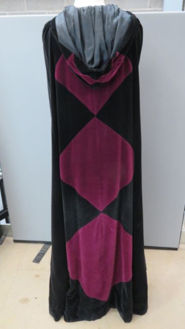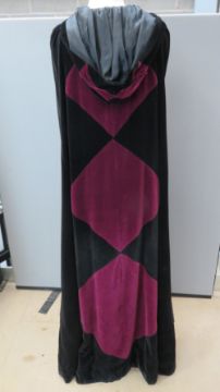 A floor length velvet cloak with hood having burgundy diamond pattern, 60" in length.