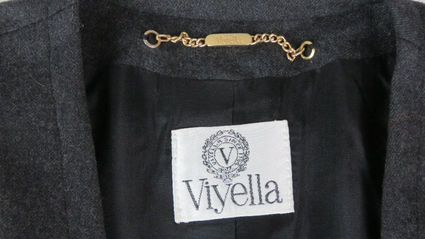 Viyella; 100% pure new wool ladies jacket and skirt, jacket UK size 16, skirt UK size 14, each with dry clean only labels within. One button deficient from jacket. Approx measurements; 44" chest, 28 1/2" length at back, 16" sleeve length underarm. Skirt - 28" length, 31" waist.