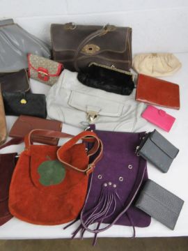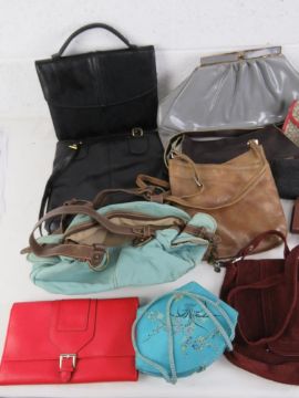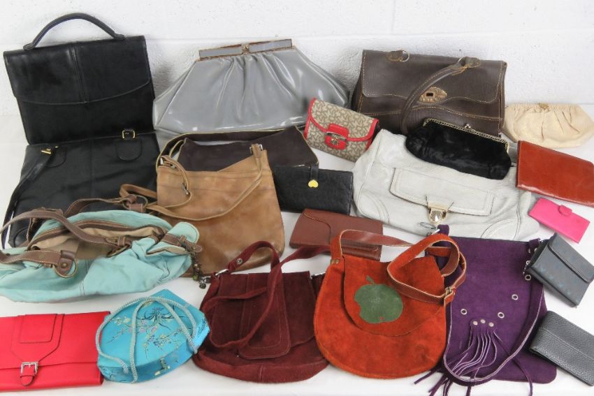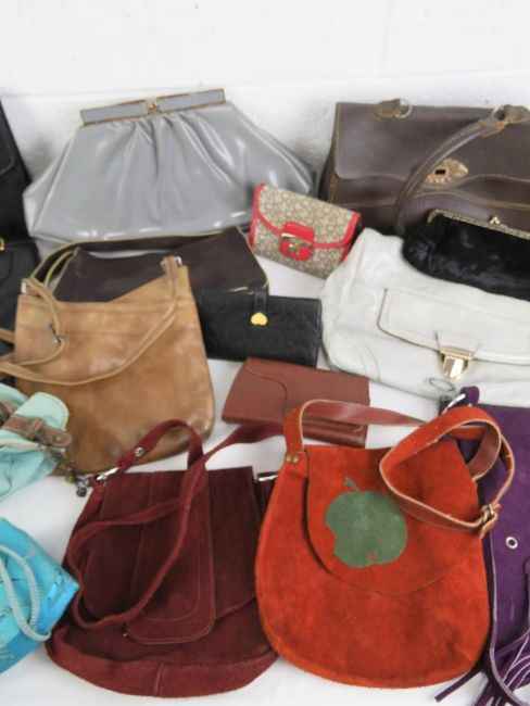 A quantity of assorted vintage and contemporary ladies handbags including 1970s suede examples, cow hide, leather, purses, etc.