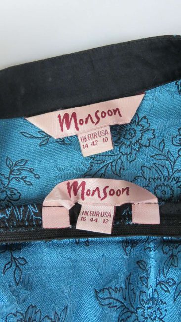 Monsoon; a silk blend jacket and skirt set, 65% silk, jacket UK size 14, skirt UK size 16. Approx measurements for jacket; 40" chest, 23 1/2" length at back inc collar, 12" sleeve length underarm. Approx approx measurements for skirt; 32" elasticated waist, 40 1/2" in length.