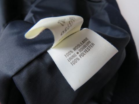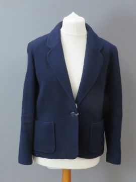 A ladies navy blue 100% pure new wool jacket, UK size 16, slightly a/f to button and slight damage to collar at back. Approx measurements; 42" chest, 26 1/2" length at back inc collar, 17" sleeve length underarm.