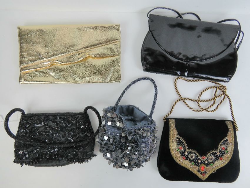 Two ladies beaded evening bags together with another in velvet having embroidery to front. Also a Charles Jordan black patent handbag and a Jane Shilton genuine leather purse. Five items.