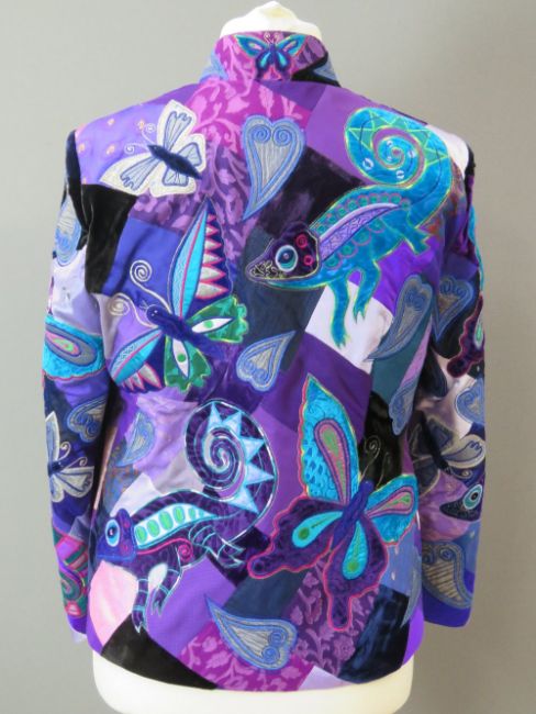 Beatrice Von Trescow; A highly decorative patchwork jacket featuring chameleons and butterflies, dry clean only label within, with two spare buttons, in unworn condition. Approx measurements; 41" chest, 26 1/2" length at back inc mandarin collar, 15 3/4" sleeve length underarm.