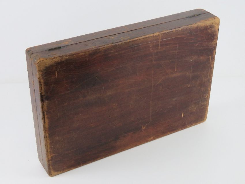 A vintage wooden display box opening to reveal padded fabric lining within, 44 x 29.5 x 7cm.