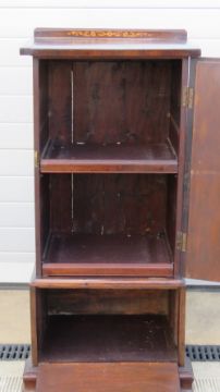 An Edwardian gramophone and music cabinet having twin slide shelves with fall front compartment under, floral inlay to under rail, 57 x 43cm, 123cm high.