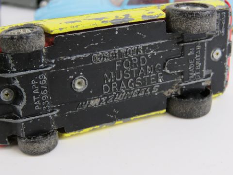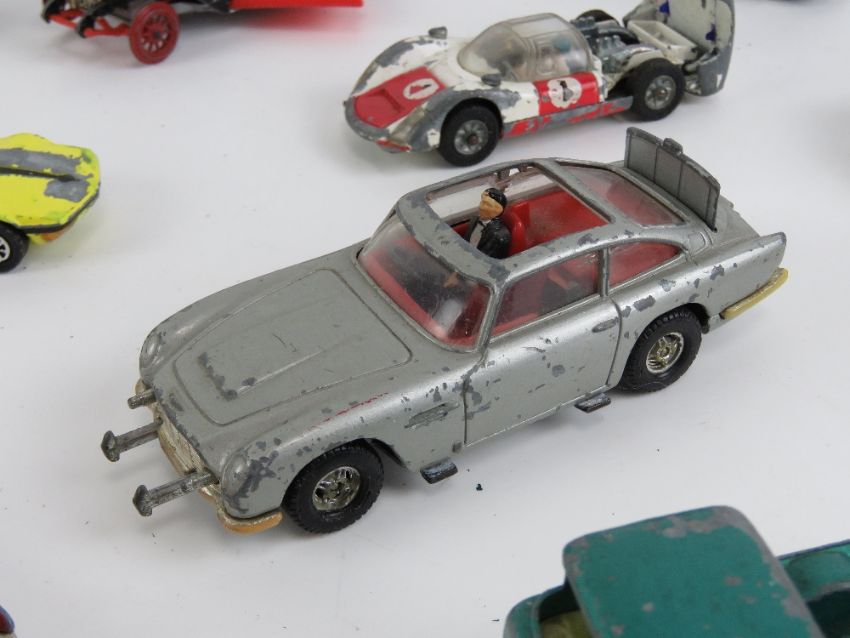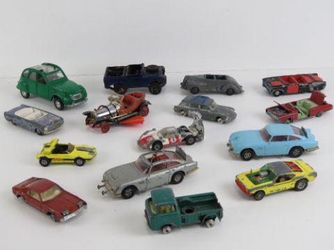 A quantity of assorted Corgi toy vehicles including two 007 Aston Martin DB5 cars, Chitty CHitty Bang Bang, Ford Mustang etc. Also a Britains Land Rover, Tonka Citroen 2cv, etc. All in play worn condition.