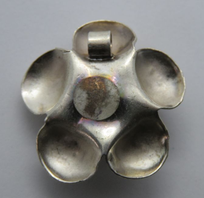 A large floral pendant, white metal no apparent hallmark, 3cm dia.