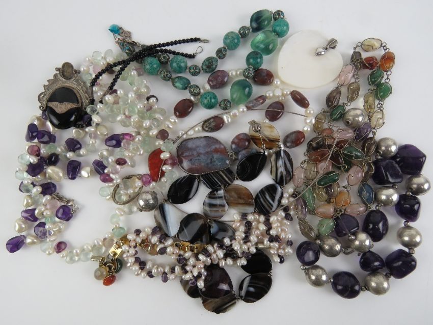 A quantity of pearl and hard stone jewellery inc amethysts, rose quartz, onyx, citrine, banded agate, etc, three having 925 silver clasps and one set in 925 silver with 925 silver chain.