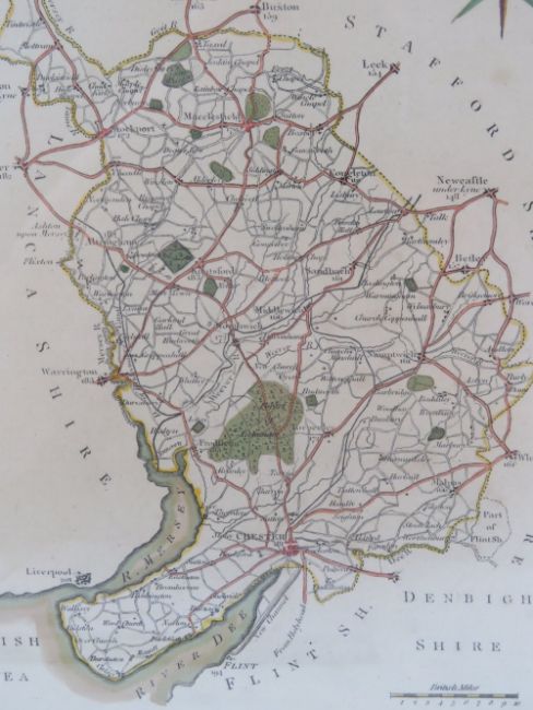 A 19th Century map of Cheshire published by Wilkes, hand coloured, 25 x 19cm.
