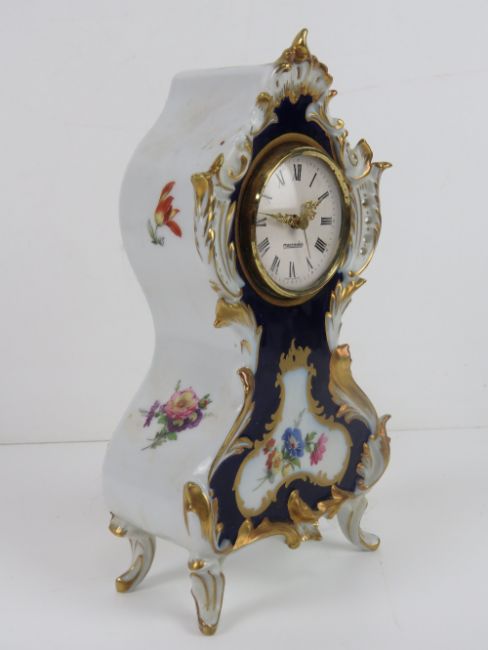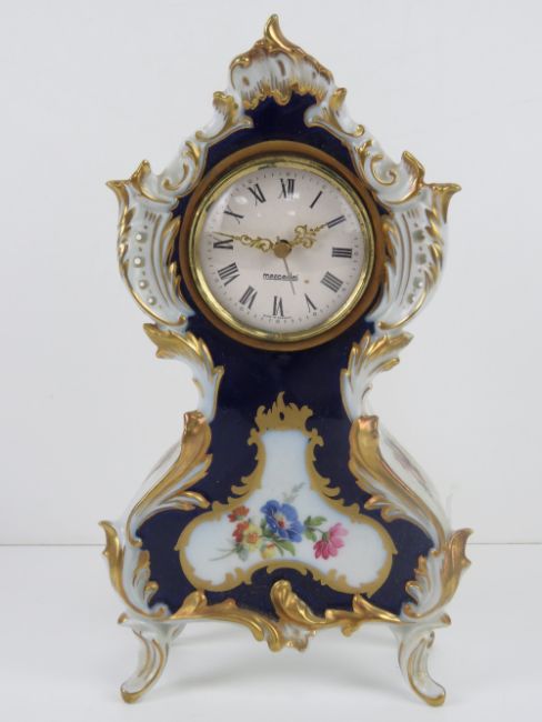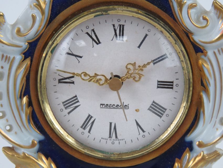 A German made ceramic mantle clock in cobalt blue and white ground with gilded and foliate decoration upon, German quartz movement, marked Kaiser W.Germany to base, standing 25cm high.