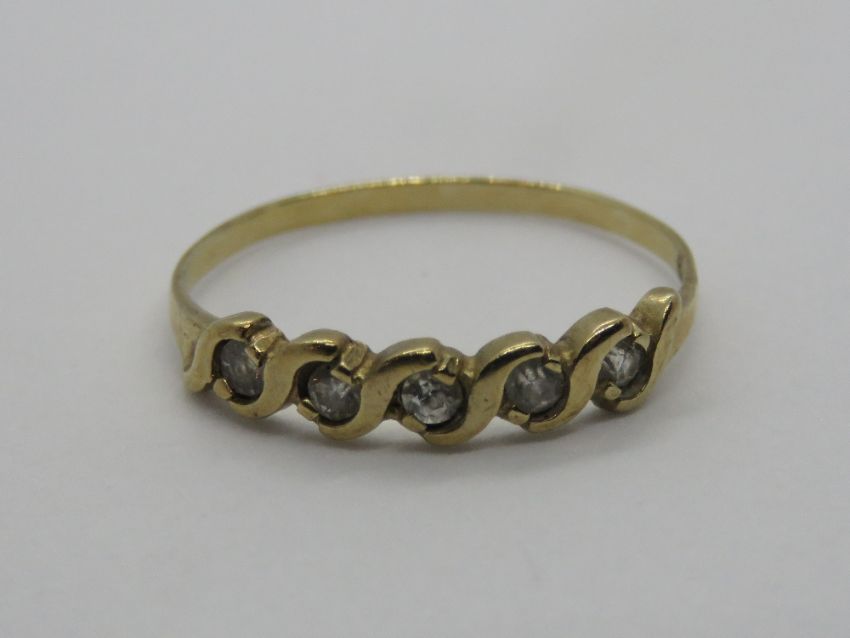 A 9ct gold ring having five white stones in wave setting, hallmarked, size N, 1g.