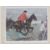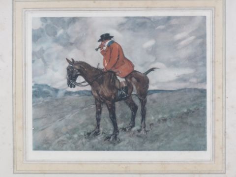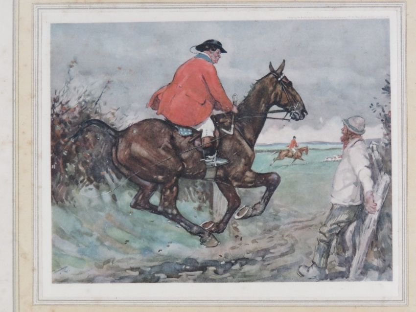 Coloured print; portly huntsman on galloping Chestnut, together with another print, portly huntsman calling to hounds, published by The British Art Company, 33 x 38cm each. A pair in Hogarth frames.