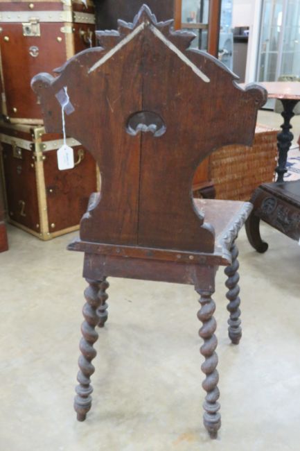 A stained oak single hall chair in Carolean revival style having pierced and carved back and opposing barleytwist legs, slightly a/f to back.