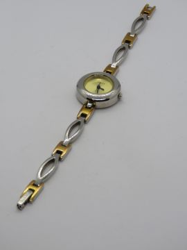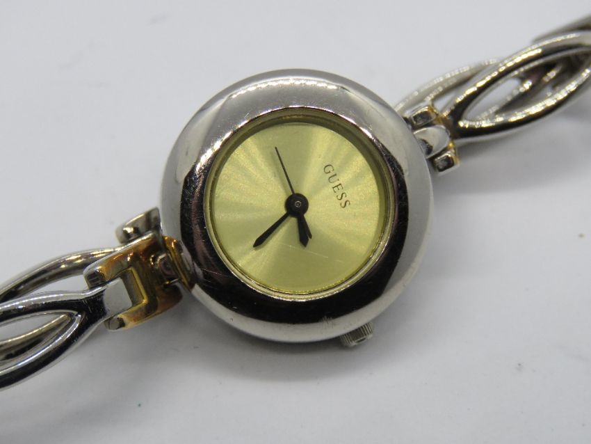 A Guess wristwatch having champagne dial with two tone bracelet strap.