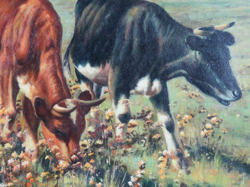 Oil on canvas; 20thC study of grazing cattle in moorland scene. Bull with cows before, more cattle beyond with moody sky over, signed lower left E Burker. Measuring 60 x 89cm.