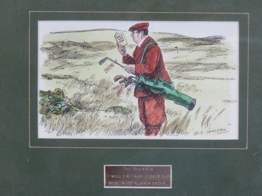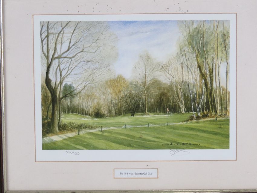 Three golfing themed prints; '13th Sunningdale' by Denis Parrett, signed in pencil to mount, 29 x 13, 'The 16th Hole Sonning Golf Club' by J.E. Bye, limited edition 36/100 signed in pencil below, 28 x 19, and 'The Beginner'.
