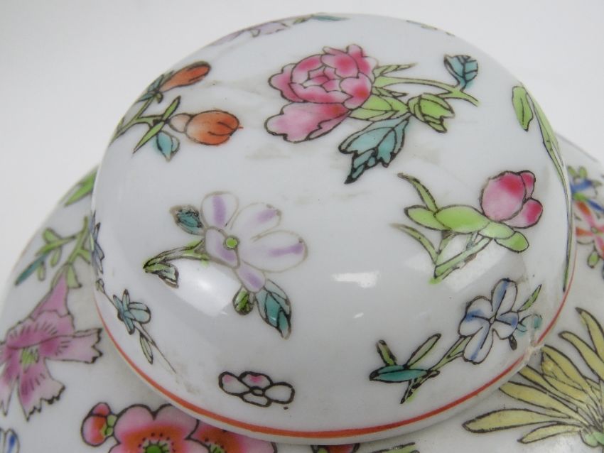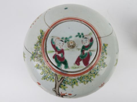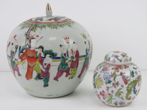 An Oriental ginger jar with cover having hand painted figural scene upon, standing 23cm high, a/f. Together with a later Chinese ginger jar with cover having phoenix and dragon with floral pattern, standing 12.5cm high. Two items.