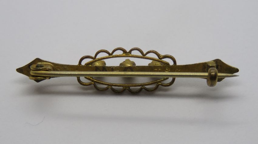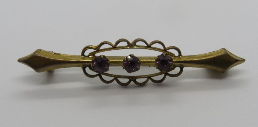 A yellow metal brooch set with three round cut purple stones, 4cm, 1.5g.