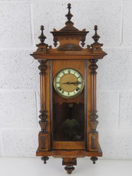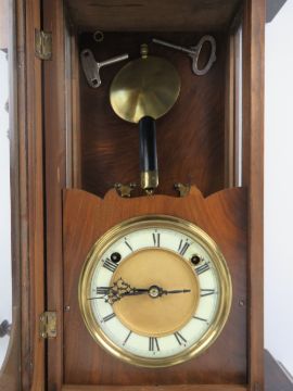 An early 20th century pine and mahogany Viennese wall clock, 6" dial, enamel chapter ring, Roman numerals, 68cm in length.