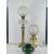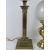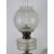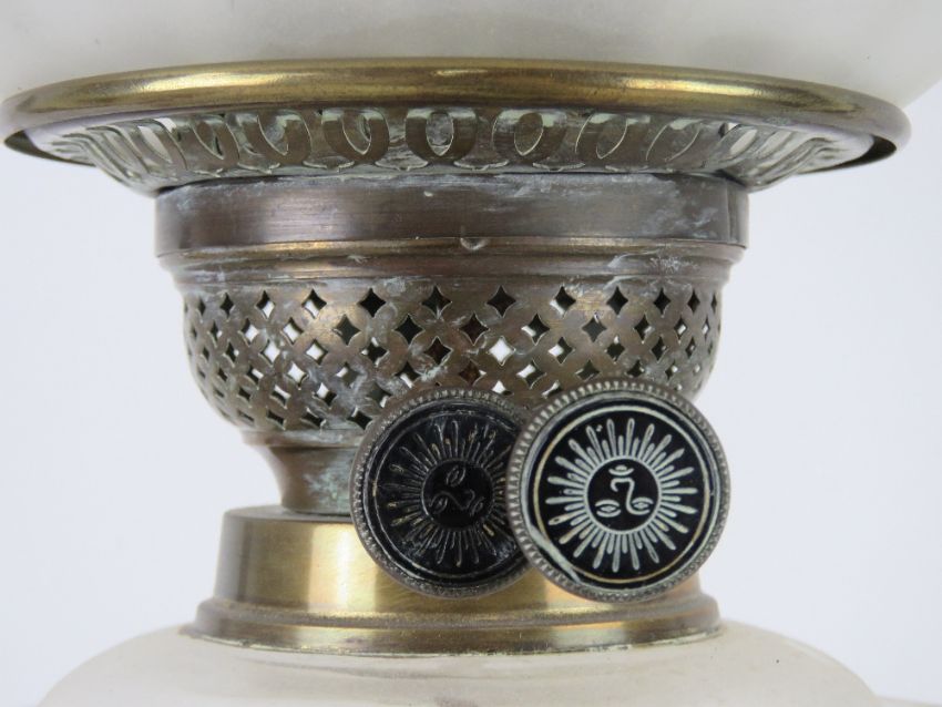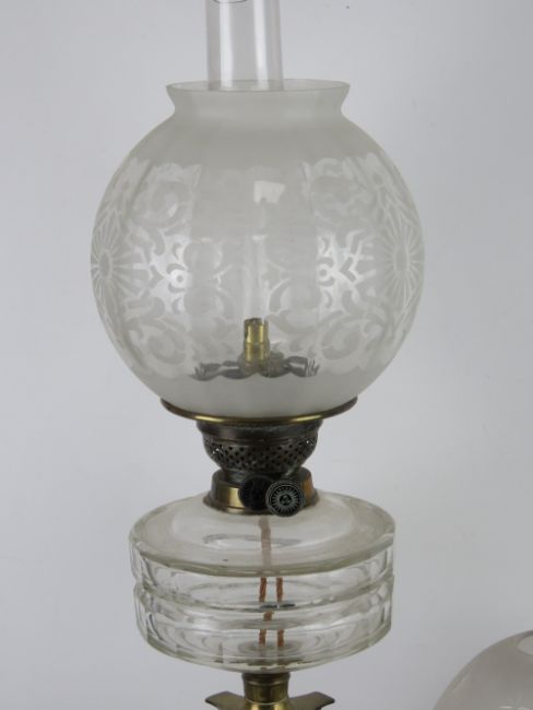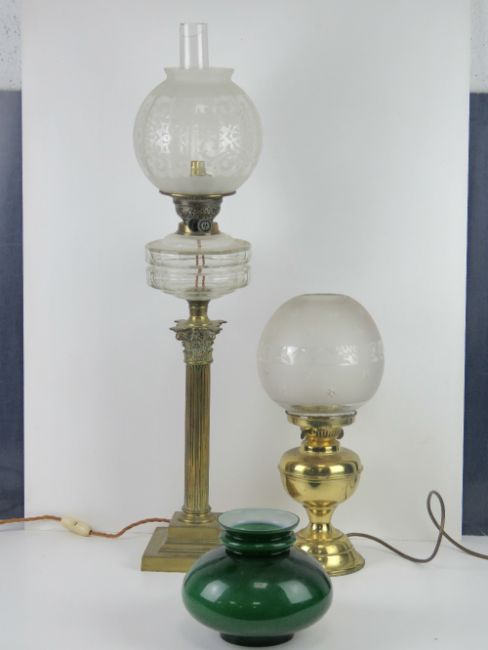 A brass oil lamp having clear glass reservoir over classical style column base, with glass chimney and shade (chimney and shade a/f) standing approx 80cm high. Together with another brass oil lamp with shade and a layered white and green glass. Three items.