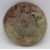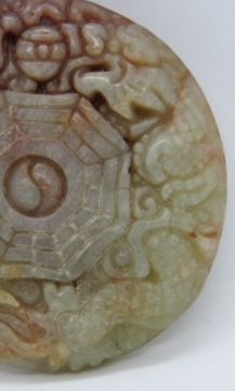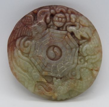 An unusual two colour carved jade disc pendant having phoenix and dragon design upon, green and red jade, 4.5cm dia.
