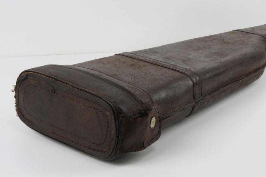 A brown leather 'leg of mutton' gun case measuring 75cm in length, leather handle a/f.