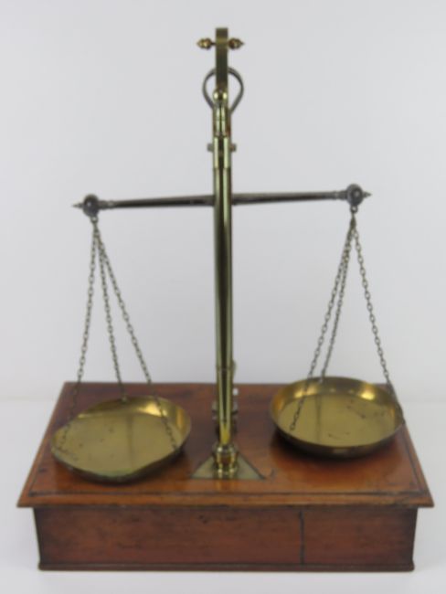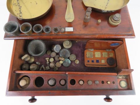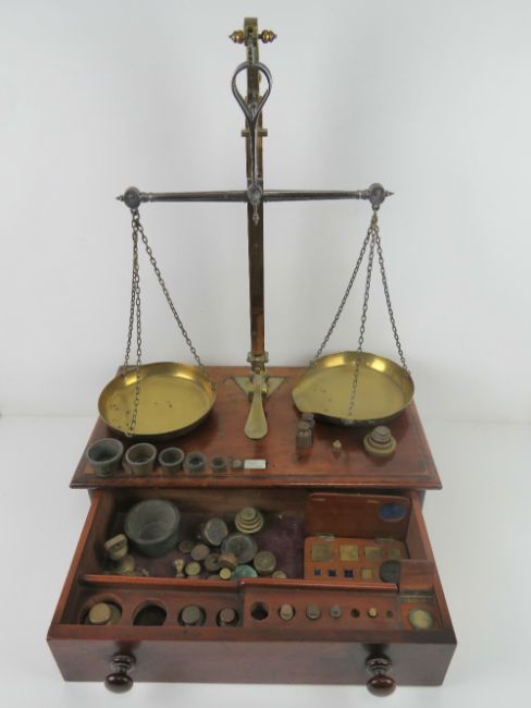 An impressive set of brass balance scales set on mahogany base with drawer under, scales made by Gardner 572 Wansworth Road, drawer opening to reveal quantity of assorted brass weights within. Base 50.5cm wide, all standing 66.5cm high.