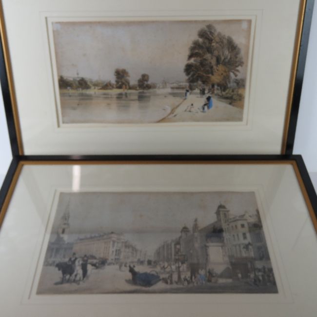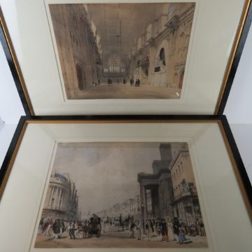 Hand coloured engravings of London; St Pauls from Ludgate Hill, Buckingham Palace from St James Park, entry to The Starnd from Charring Cross, Temple Bar from The Strand, The Horse Guards from St James Park, The Custom House, Regent Street looking towards The Quadrant, The Strand, and unknown London Chapel. Nine prints, each 31 x 42cm, in matching ebonised frames.