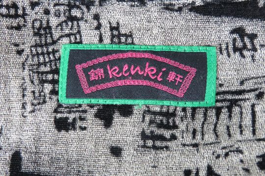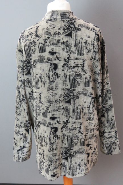 Ladies oriental pattern jacket by Kenki, dry clean only label within. Approx measurements; 47" chest, 32 3/4" length at back inc mandarin collar, 18 3/4" sleeve length underarm.