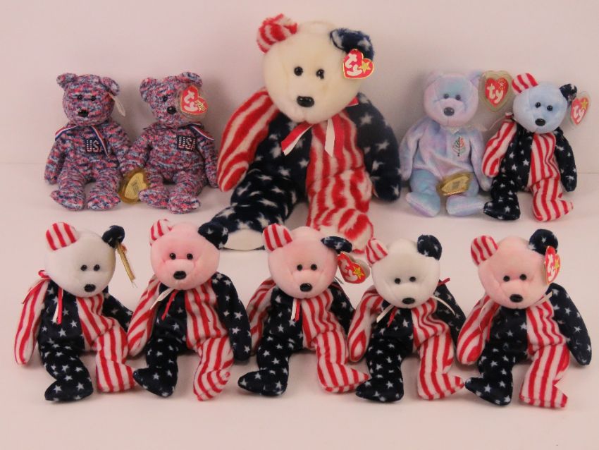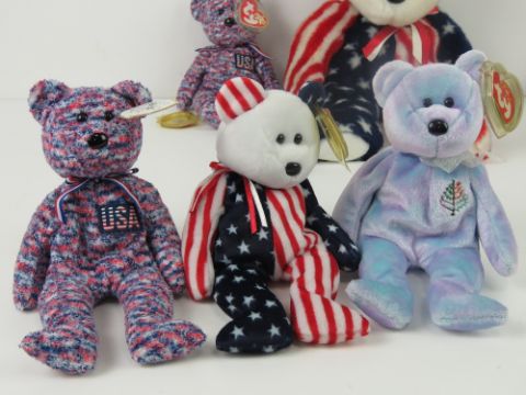 Ty Beanie Babies/Beanie Bears; American themed 'Issy' the Four Seasons Hotel San Francisco with tag, 'Spangle' blue face, 'Spangle' pink face (two with tag, one with loose tag), 'Spangle' white face (one with tag, one with loose tag), 'USA 2000' x 2 (both with tags). Together with a Beanie Buddy large size bear 'Spangle' with white face (with tag, some marks to back of head). Ten items.