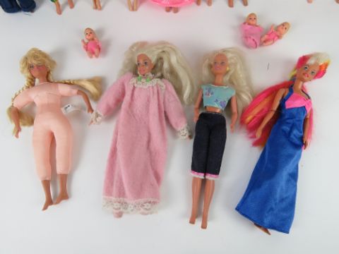 A quantity of assorted Sindy and Barbie dolls, one having jointed elbows and knees, two with soft bodies, another with jointed elbows, including three babies. Eighteen items.