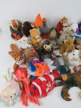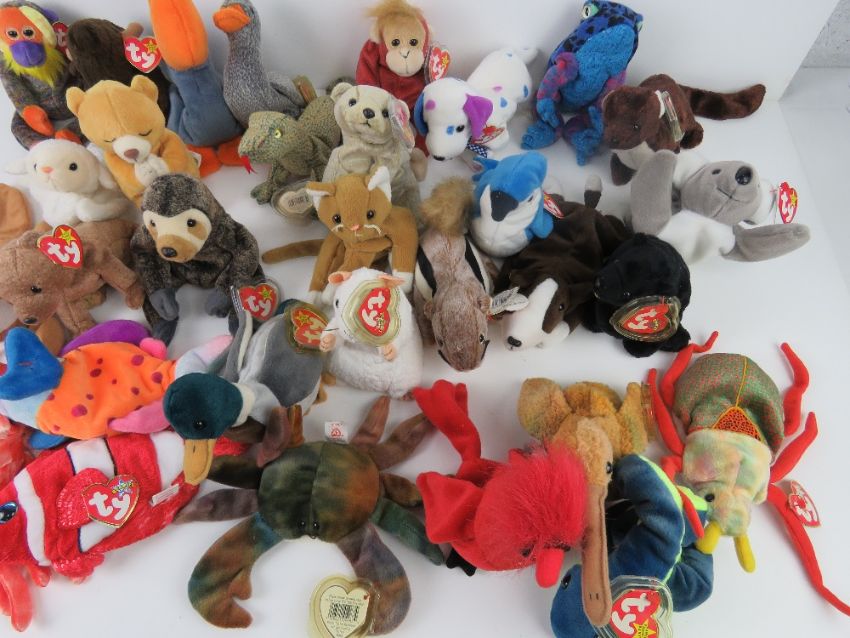 A large quantity of Ty Beanie Babies all with tags; 'Bananas', 'Runner', 'Scurry', 'Mac', 'Pecan', 'Cinders', 'Dizzy', 'Scaly', 'Slowpoke', 'Scoop', 'Dart', 'Beak', 'Claude', 'Sly', 'Honks', 'Almond', 'Hissy', 'Jake', 'Chipper', 'Roam', 'Rocket', 'Jester', 'Wiggly', 'Schweetheart', 'Goochie', 'Lips', 'Cheezr' and 'Mel'. Together with four Beanie Babies without tags being 'Hope', 'Bruno', 'Nip' and 'Fleece'. Thirty-two items.
