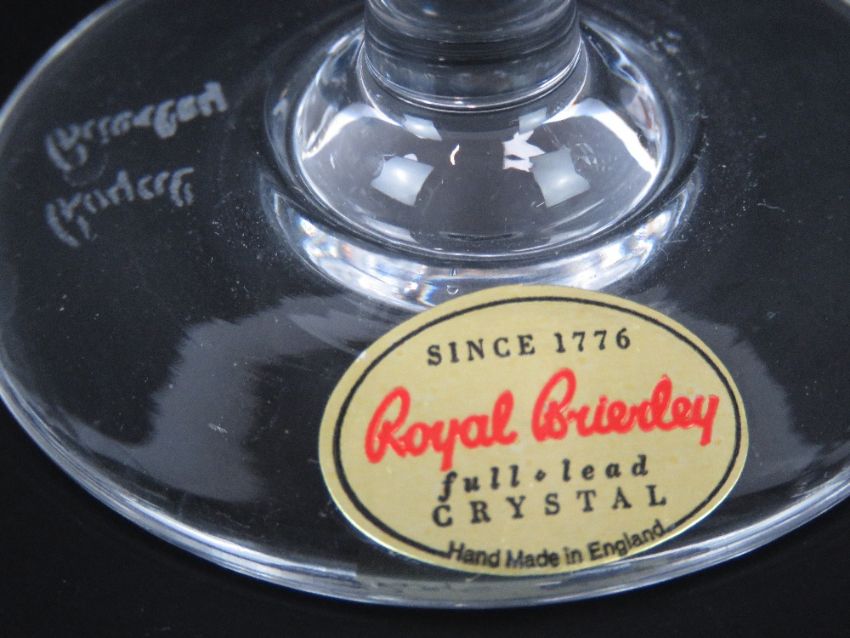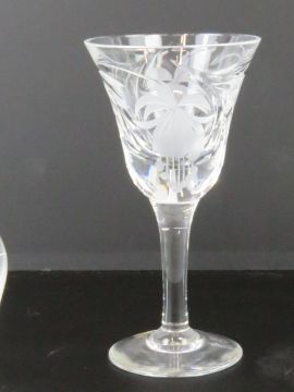 A Waterford Crystal cut glass small bowl, 10cm dia, with matching vase standing 10.5cm high, together with a Royal Brierley Crystal liqueur glass having etched fushia design upon, standing 14cm high with similar bud vase and a millifoure 5cm at widest. Four items.