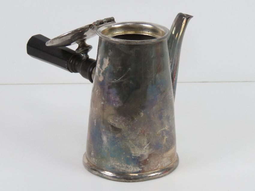 A silver plated hot chocolate pot having ebonised wooden side handle, standing 17.5cm high.