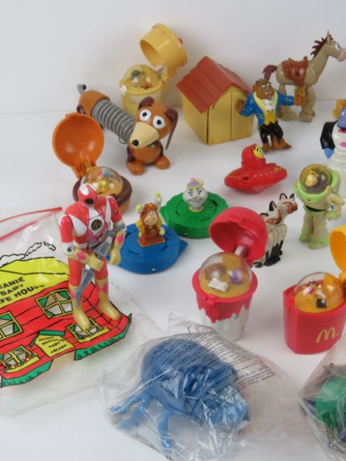 A quantity of assorted Disney, McDonald's, Burger King toys including Coca Cola bears, Woody and Jess, Donald Duck, Toy Story watch, Beauty and the Beast, three Dwarves, Magic Roundabout, Sooty & Sweep, etc.