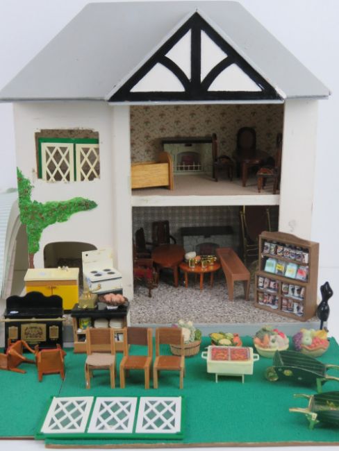 A hand built doll's house together with a large quantity of furniture and accessories inc metal sewing machine and tailor's dummy, chairs and dining table, clock, metal wheelbarrows, fireplaces, and shop items. Also some dolls house decorating items.