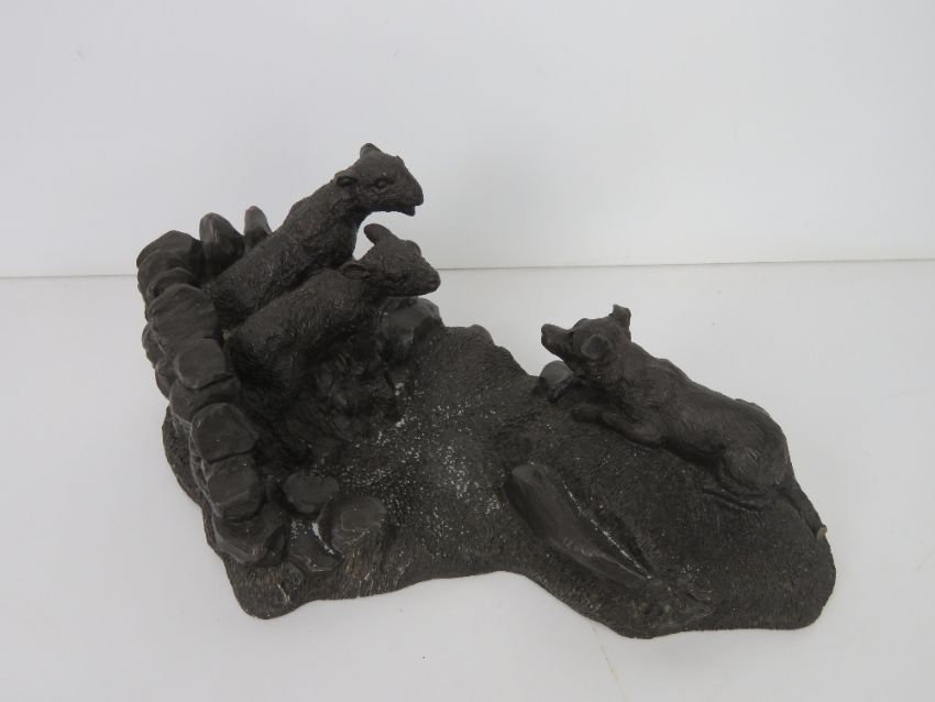 A heredites bronzed figurine of a sheep dog and lambs.