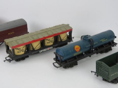 A quantity of Triang Hornby model railway goods carriages inc R117 Shell tanker and two other Shell tankers, R139 Westwood Pickles and Royal Mail carriages with parcel-drop sides, etc.