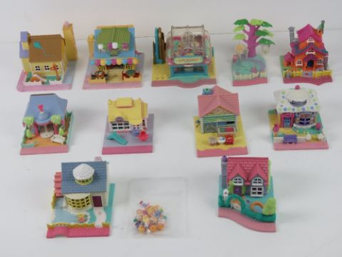 Polly Pocket; a quantity of c1990s buildings with front pavement including houses and shops includes a two-tier 'glass' roofed supermarket, ice cream parlour, clothes shop with revolving front door, pizza parlour, cafe, toy shop, watermill house, school house etc. Eleven items. Together with ten Polly Pocket figures.