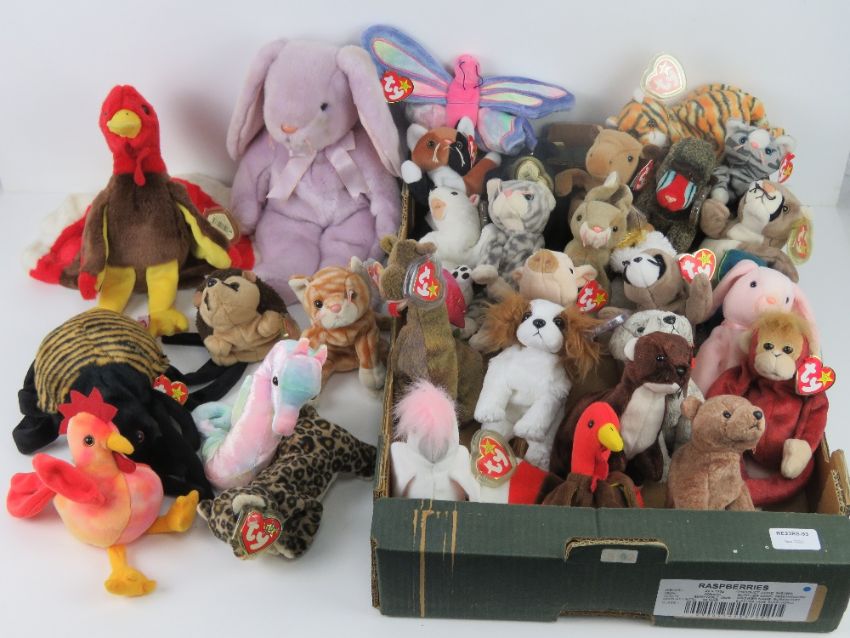 A large quantity of Ty Beanie Babies all with tags; 'India', 'Prickles', 'Chip', 'Luke', 'Prance', 'Sneaky', 'Amber', 'Derby', 'Cheeks', 'Canyon', 'Aurora', 'Nibbly', 'Neon', 'Darling', 'Rainbow', 'Scortch', 'Silver', 'Knuckles', 'Ringo', 'Hoppity', 'Strut', 'Regal', 'Runner', 'Tricks', 'Schweetheart', 'Kuku', 'Flitter' and 'Pecan'. Together with 'Gobbles' without tag, also large size Beanie Buddies being purple rabbit without tag, 'Gobbles' with tag and 'Spinner' with tag. Thirty-two items.