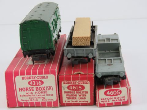 A quantity of Hornby Dublo 'Super detail' 00 wagons including good wagon, coal wagon, grain wagon, fridge wagon, horsebox with horse, double bolster wagon and 40 tonne bogey wagon.