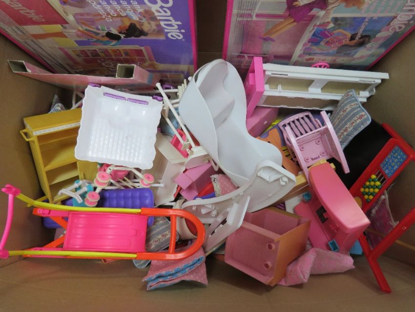 Barbie, Sindy, etc, a large quantity of furniture and parts inc beauty salon counter with cash register, cafe, chairs, grandfather clock, high chairs, microwave, baby bath, picnic furniture, together with a large quantity of furniture items including books, food, cutlery, food mixer, dogs, dog baskets, prams, bikes, school board, part bank set including safe and ATM top, dressing table stool, hair brushes, bedding, aquarium, pool lilo, vacuum cleaner, jacuzzi bath, etc. An extensive collection of parts. a/f, sets not complete.