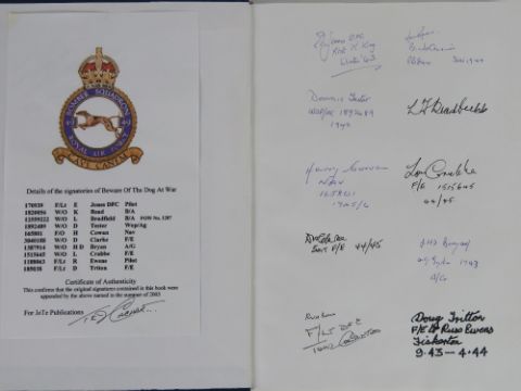 'Beware of the Dog at War 49 Bomber Squadron Operational Diary' by John Ward, signed within Flight Lieutenant E Jones DFC, Warrant Officer K Read, Warrant Officer L Bradfield, Warrant Officer D Tester, Flight Officer H Cowan, Warrant Officer L Crabbe, Warrant Officer D Clarke, Warrant Officer H D Bryan, Flight Lieutenant R Ewens and Flight Lieutenant D Triton. Hardback book.