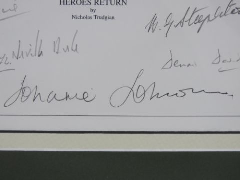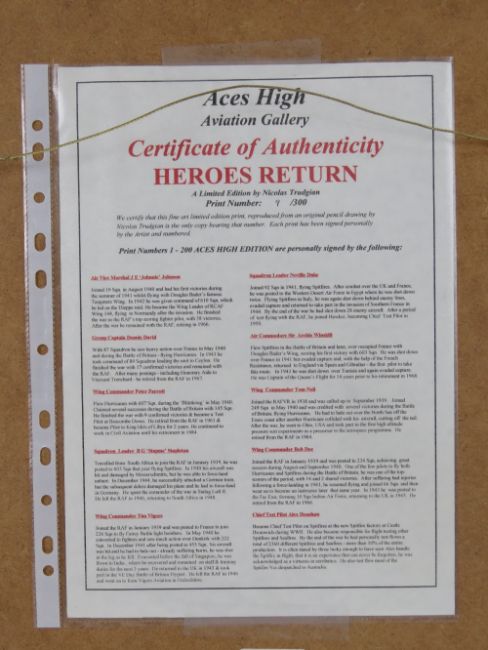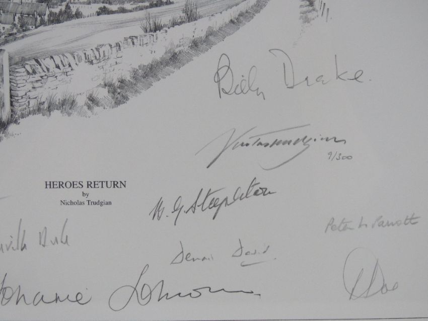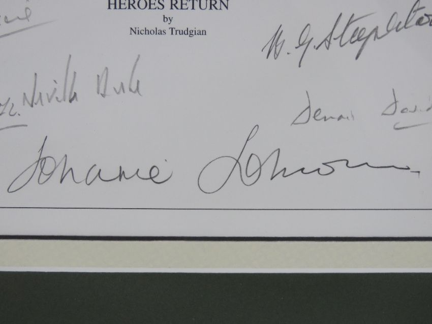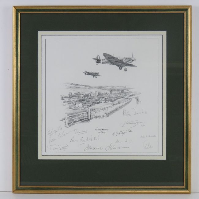 Nicholas Trudgian, signed limited edition print, 'Hero's Return', 9/300, signed by the artist and further signed by Air Vice Marshal J E 'Johnnie' Johnson, Group Captain Denis David, Wing Commander Peter Parrott, Squadron Leader B G 'Stapme' Stapleton, Wing Commander Tim Vigors, Squadron Leader Neville Duke, Air Commodore Sir Archie Windskill, Wing Commander Tom Neil, Wing Commander Bob Doe , Chief Test Pilot Alex Henshaw and two others, measuring 32 x 32cm, framed and mounted, frame measuring 50.5 x 53cm. With cert.
