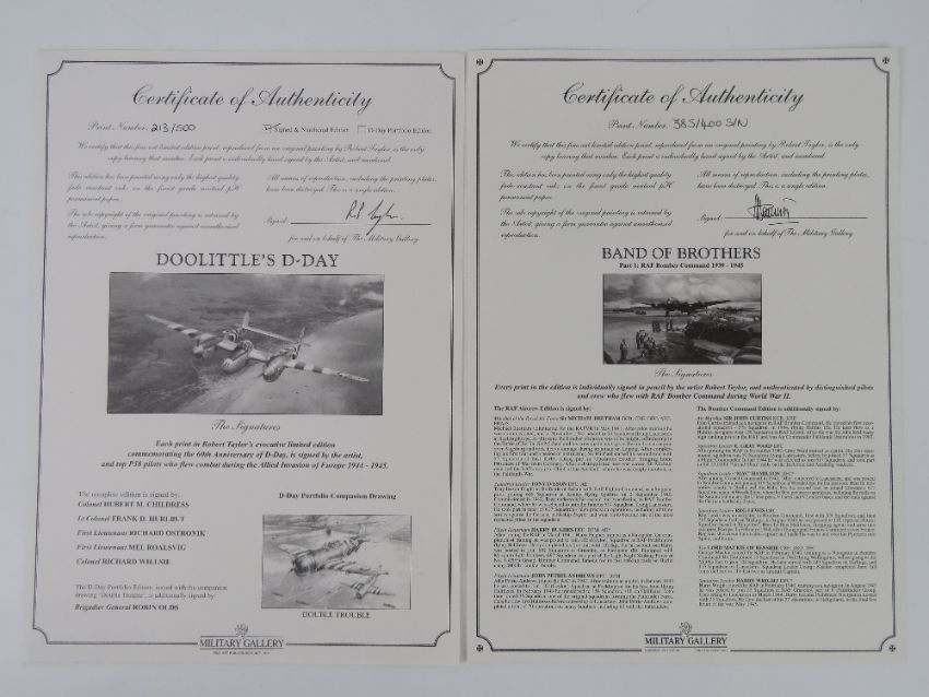 Robert Taylor, two signed limited edition prints, each with cert; 'Band of Brothers', 385/400, signed by the artist and further signed by Marshall of the Royal Airforce Sir Michael Beetham GCB CBE DFC AFC FRAeS, Squadron Leader Tony Iveson DFC AE, Flight Lieutenant Harry Hughes DFC DFM AE, Flight Lieutenant John Petrie-Andrews DFC DFM and others (approx 19 signatures in total), picture measuring 61 x 40.5cm, 'Doolittles D-Day', 213/500, signed by the artist, further signed by Colonel Hubert M Childress, Lt Colonel Frank D Hurlbut, First Lieutenant Richard Ostronik, First Lieutenant Mel Roalsvig and Colonel Richard Willise, picture measuring 78 x 40.5cm.