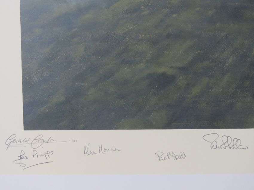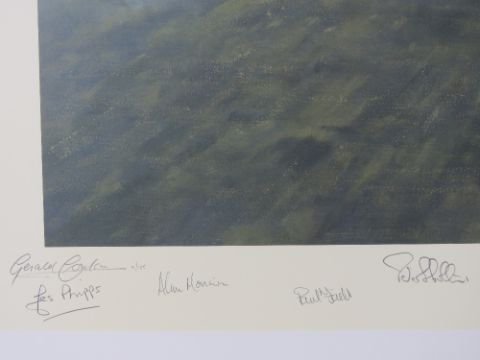 Gerald Coulson, signed limited edition print, 'A Bolt For The Blue' 11/125, signed by the artist and further signed by Air Vice Marshall George Black CB OBE AFC, Flight Lieutenant Ian Black, Air Vice Marshall Peter Collins, Flight Lieutenant Hedley Molland, Air Commodore John Mitchell CB OBE AFC, Wing Commander Jimmy Dell OBE, Group Captain Ian Thompson, Flight Lieutenant Paul Field, Flight Lieutenant Alan Page and Flight Lieutenant Ian Small, picture measuring 63 x 43cm, with cert.