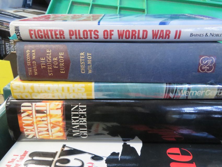 A box containing a quantity of assorted military and aviation themed books. Including a number of Tom Clancy novels.