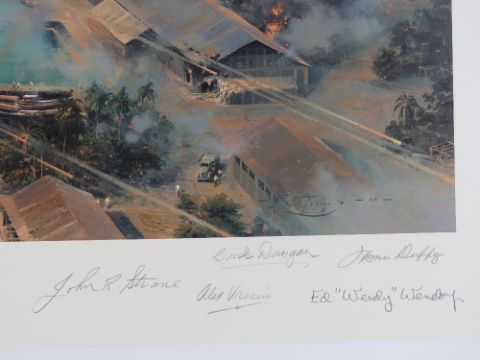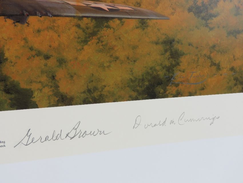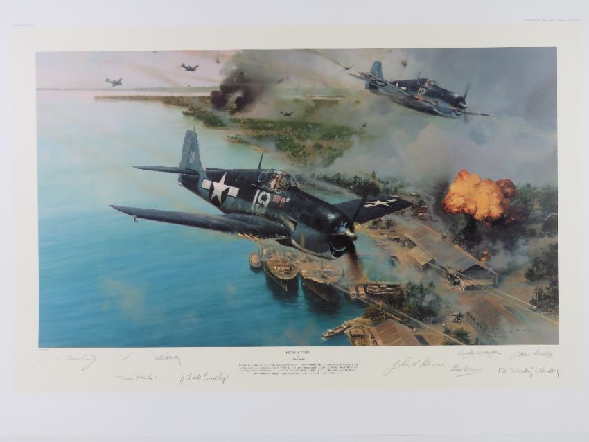 Robert Taylor, two signed limited edition prints, each with cert; 'Hellcat Fury', 14/300, signed by the artist and further signed by Commander Willis E Hardy USN, Commander Hamilton McWhorter USN, Commander Alex Vraciu USN, Commander John 'Ted' Crosby USN, Lt Commander Fred 'Buck' Dungan USN, Lt Commander James E Duffy USN, Captain John R Strane USN and Commander Ed 'Wendy' Wendorf USN, picture measuring 71 x 40.5cm, and 'Mustangs On The Prowl', 60/500, signed by the artist and further signed Major Bill Allen, Colonel Gerald Brown and Colonel Donald Cummings, picture measuring 74 x 41cm.