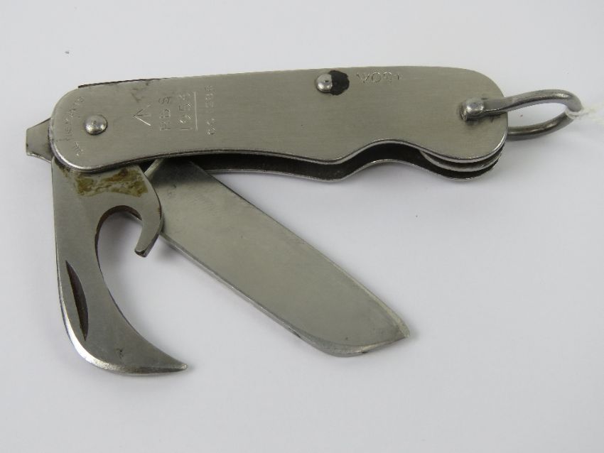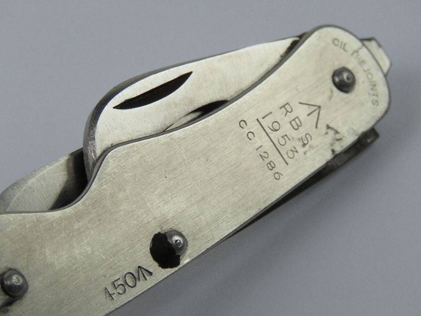 A British army knife being blade and bottle/can opener, having broad arrow upon and dated 1953.
